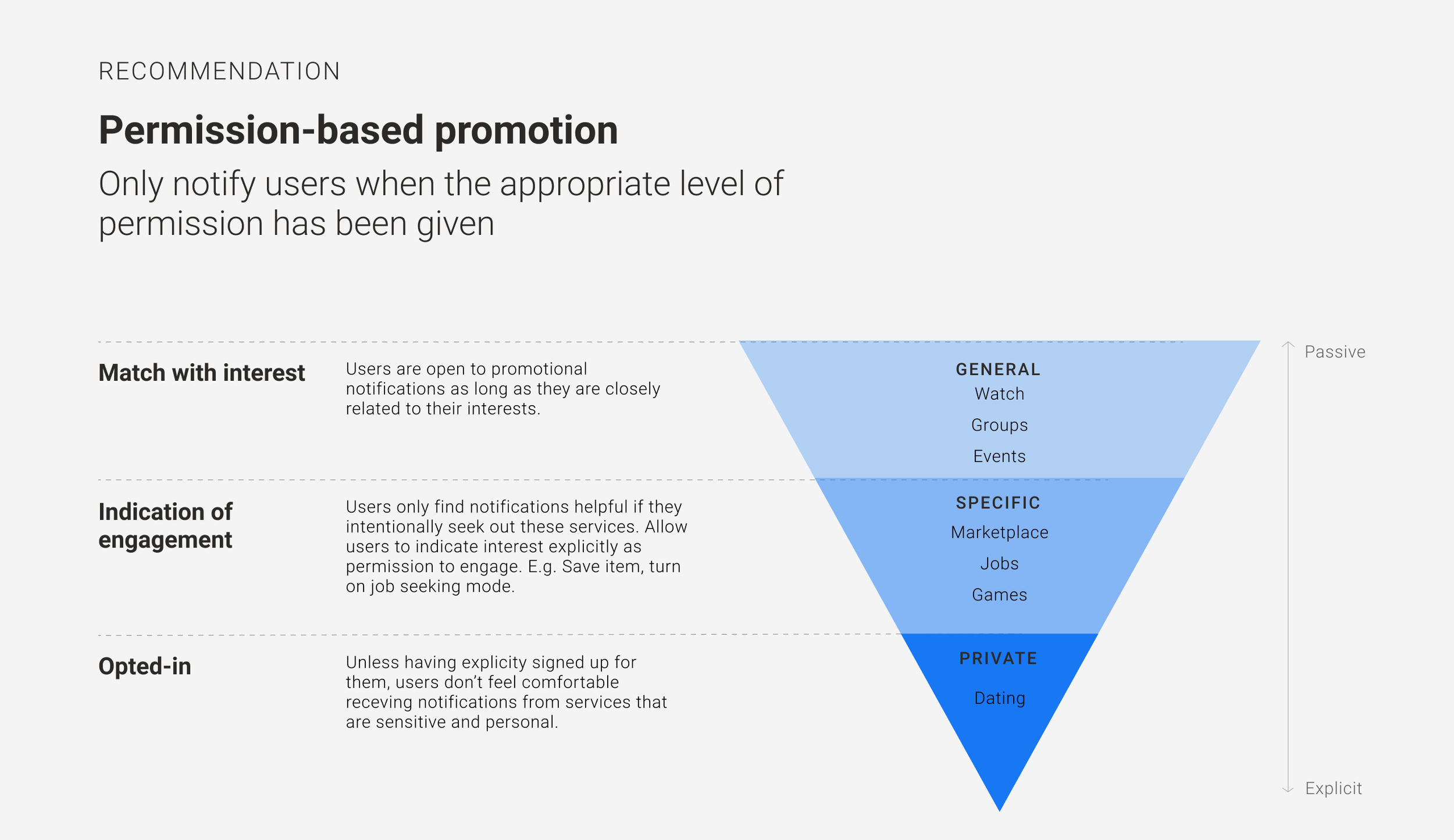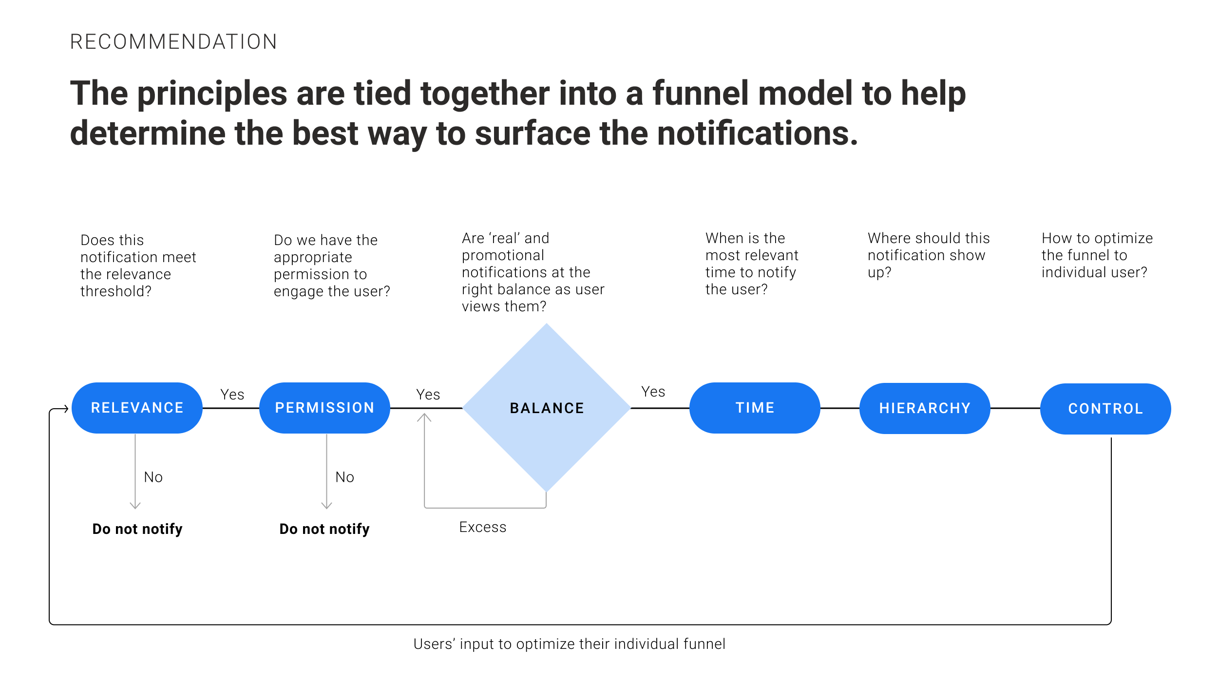 We then developed a tool kit to help our client improve their notifications for users. Each Principle fit into a flow chart or series of filters that could be followed to ensure notifications are not annoying.