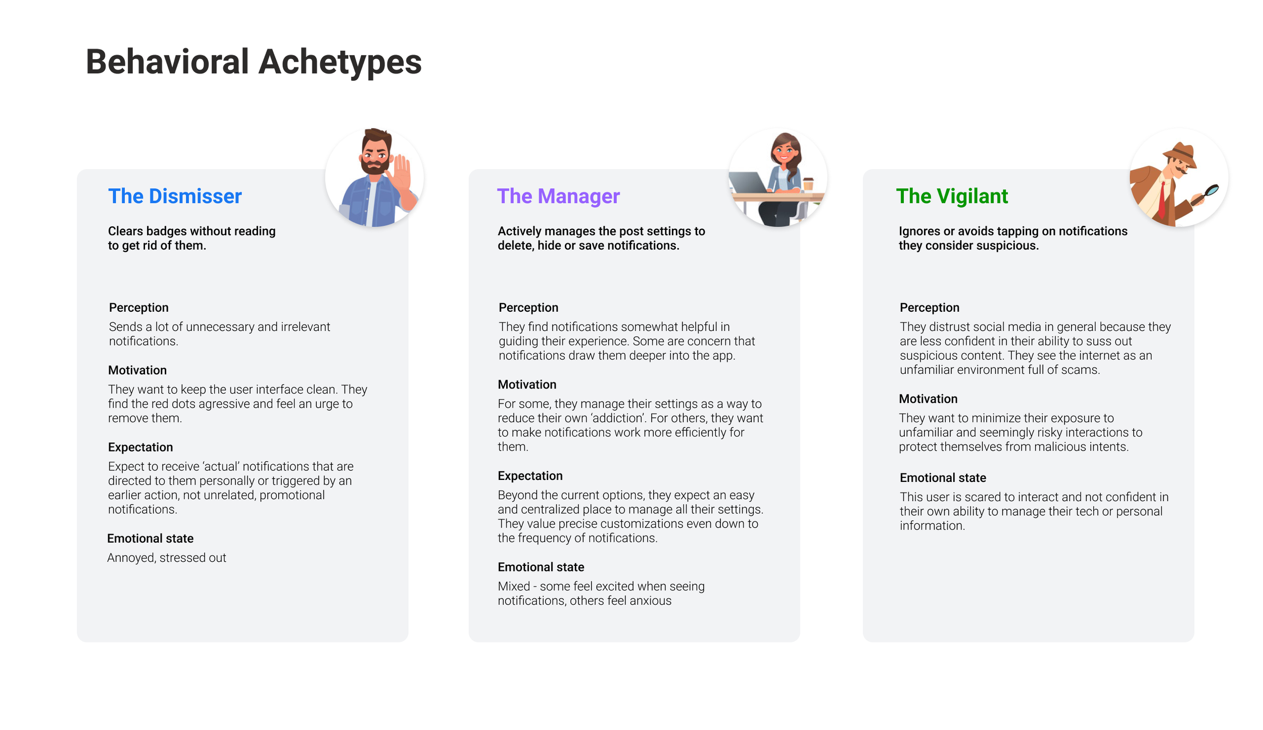 During our synthesis we also uncovered some behavioural archetypes which described the different coping mechanisms users employed to deal with too many unwanted notifications.