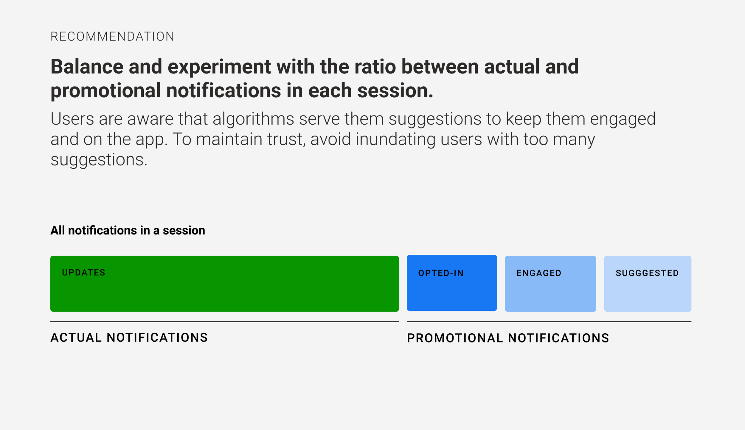 Keep the quantity and frequency of ‘real’ vs promotional notifications in balance so users don’t feel bombarded.